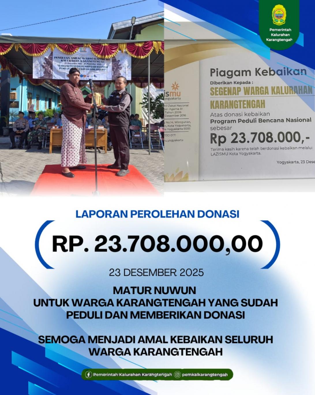23 Desember 2025 17:13:26 WIB Regita AyuDalam peringatan Hari Jadinya yang ke-102, Kalurahan Karangtengah menyelenggarakan Upacara Hadeging Kalurahan, sebuah tradisi yang penuh makna. Acara ini digelar di halaman Kalurahan Karangtengah pada Selasa (23/12) pagi. Upacara ini merupakan momen penghormatan atas perjalanan panjang kalurahan sej... ..selengkapnya