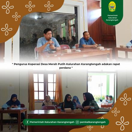 Karangtengah - Pengurus Koperasi Desa Merah Putih Kalurahan Karangtengah adakan rapat perdana pada Selasa siang (2/9) di Aula Kalurahan Karangtengah. Pada acara ini hadir Lurah berserta pamong kalurahan karangtengah, bamuskal, dan beberapa tokoh masyarakat. Pada sambutannya lurah berharap langkah nyata dari pengurus kopdes untuk segera memulai unit usahanya. Serta bapak lurah juga memohon bantuan semua unsur untuk ikut memsosialisasikan kepada masyarakat luas. Pada kesempatan ini pula pengurus dan anggota koperasi desa membayarkan iuran pokok sebesar Rp. 100.000;